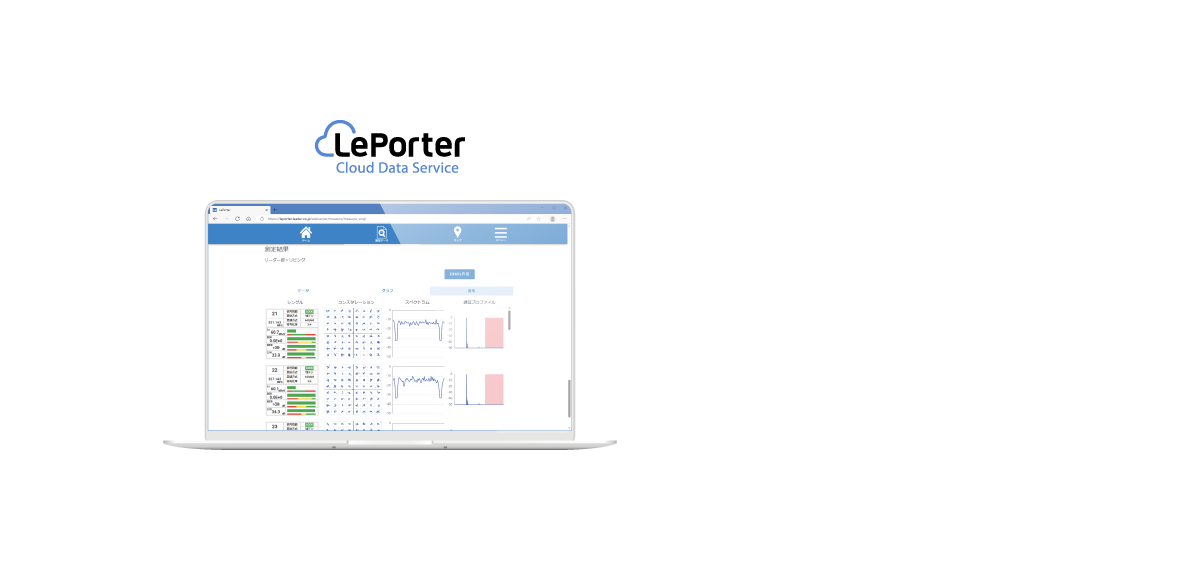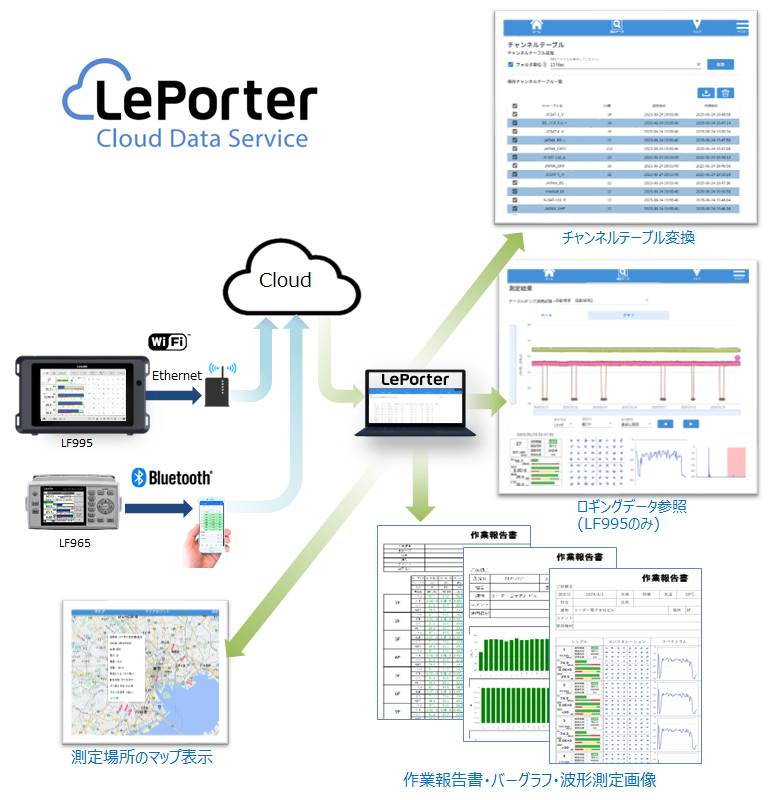 LePorter(リポーター)は、LF995/LF965 で取得した測定データをクラウドサーバーにアップロードし、データを保存・管理および報告書の自動作成ができる新しいサービスです。
